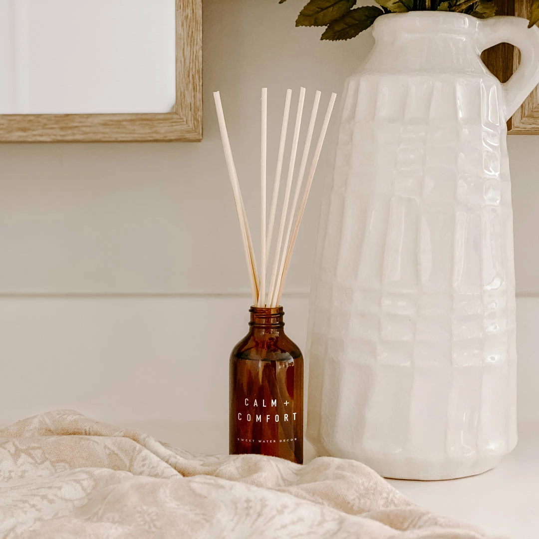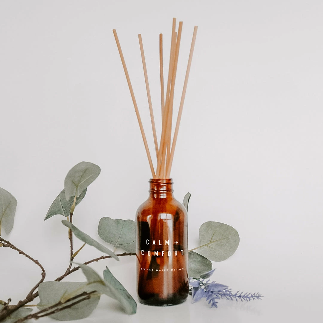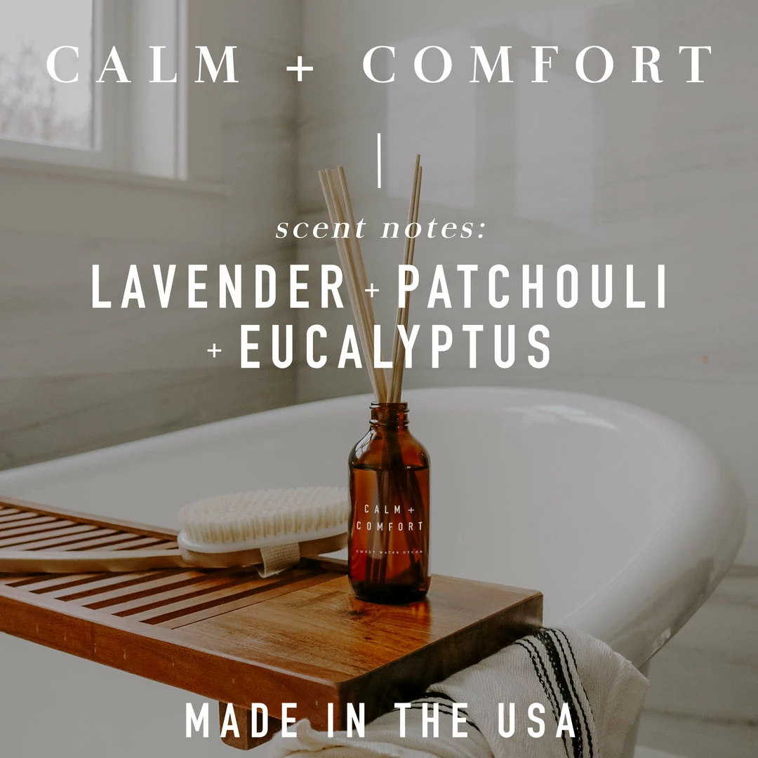 Our Calm + Comfort amber reed diffuserΒ is a very grounding scent, with gentleΒ notes of lavender, patchouli and eucalyptus. After a long day, savor the calming aroma of the Calm + Comfort reed diffuser to help you relax and unwind.Β The tranquilizing fragrance is strong enough to enjoy in your room with the soothing scent, without being over-powering.Β
