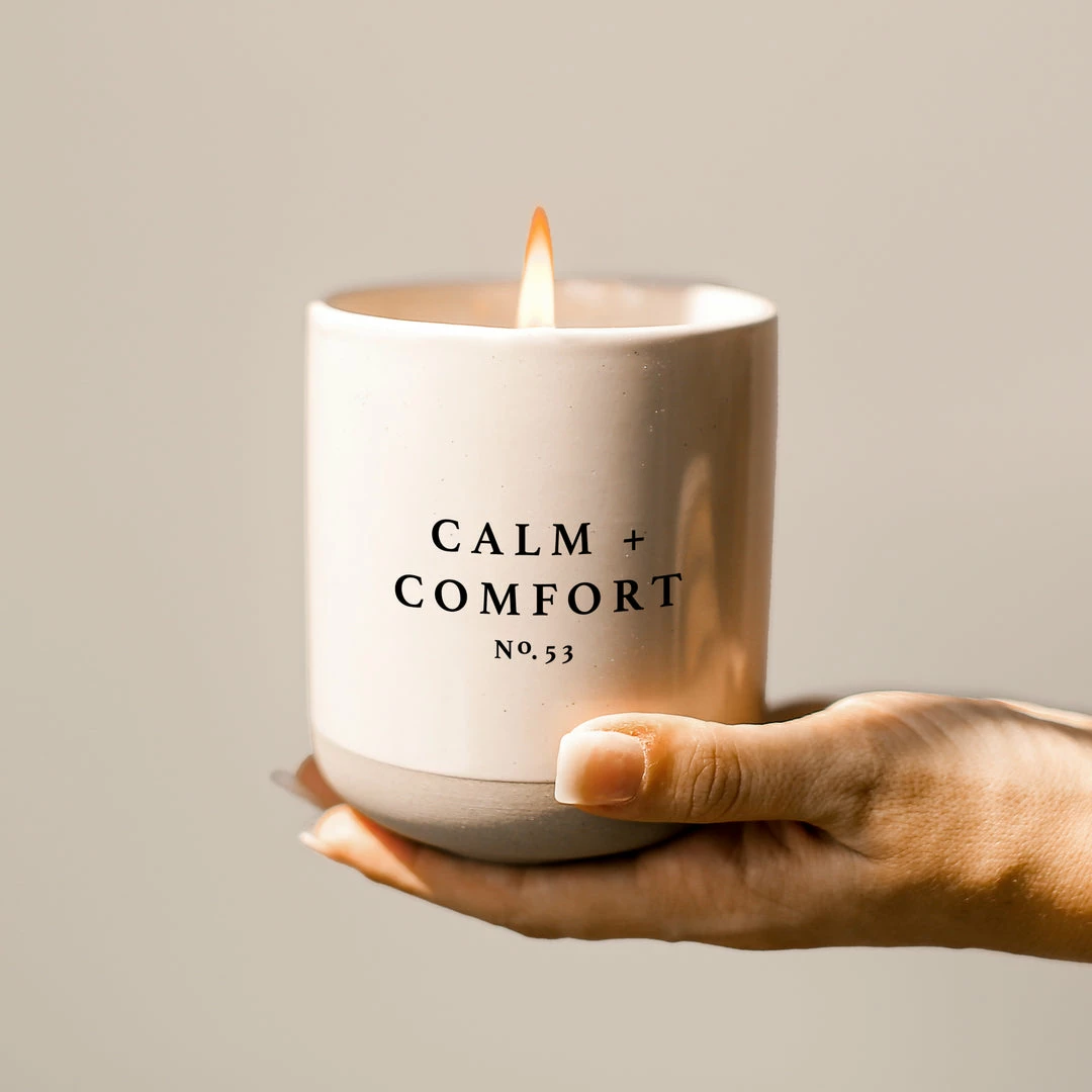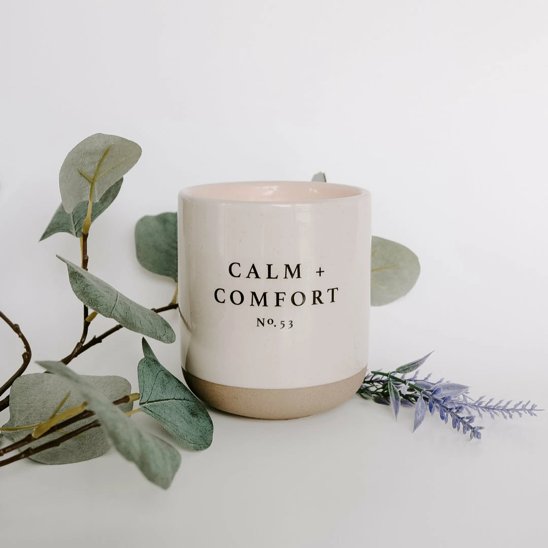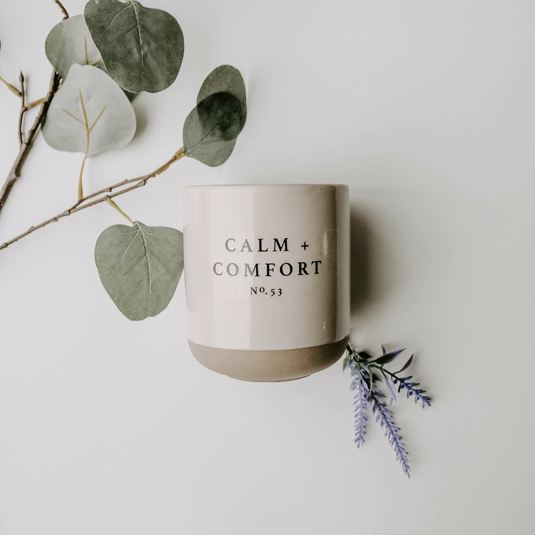Our Calm + Comfort soy candle is a very grounding scent, with gentleΒ notes of lavender, patchouli and eucalyptus. After a long day, light our Calm + Comfort candle to help you relax and unwind.Β The tranquilizingΒ candle fragrance is strong enough to fill your room with the soothing scent, without being over-powering.Β