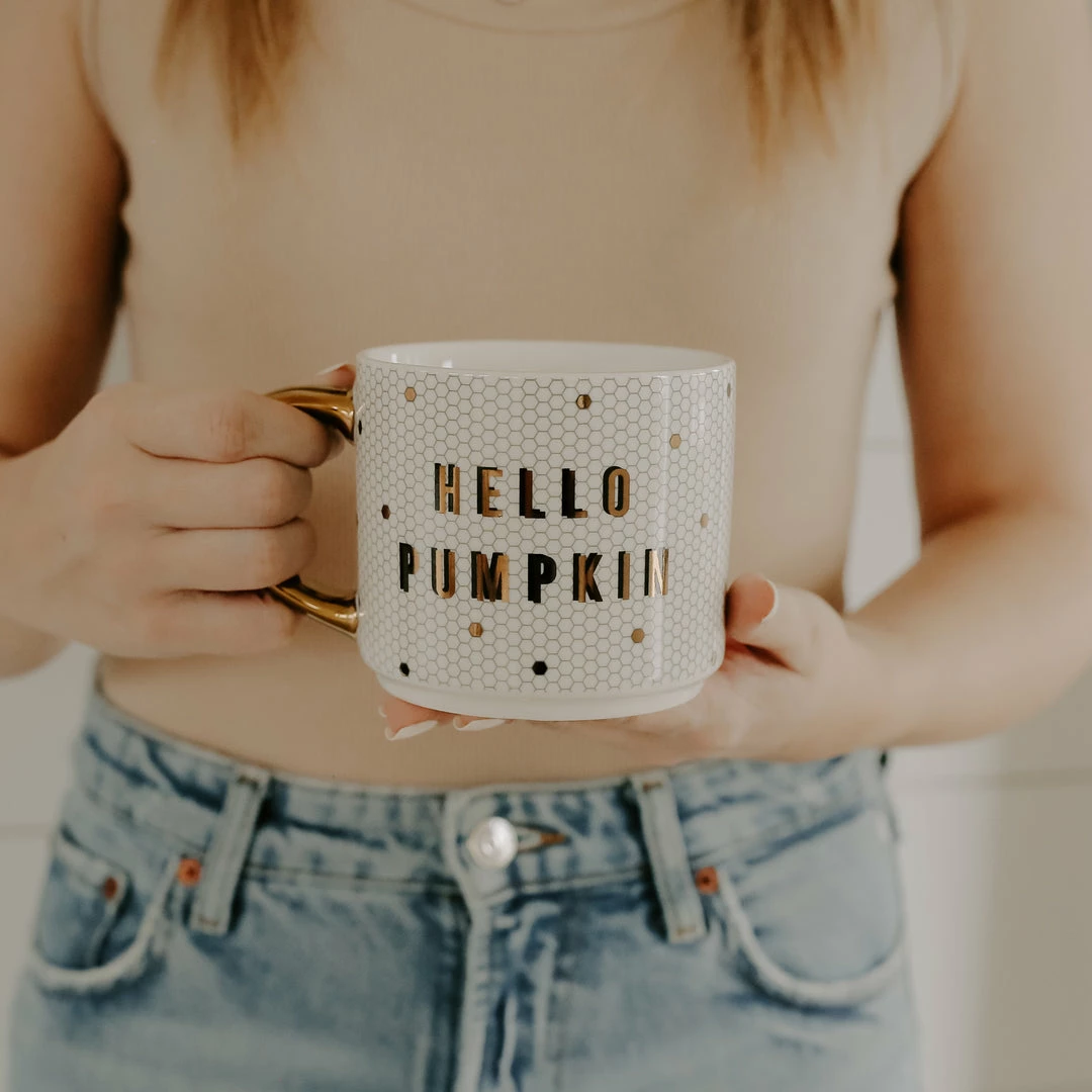 Our Hello Pumpkin Tile Coffee Mug, with itsΒ real gold embellishing on the handle and design, is designedΒ to enhance your coffee drinking experience. It also doubles as decor on the open shelving in your kitchen!Β Our tile mugs are stackable, so you can pick your favorite designs and display them, making them both functional and beautiful.Β This pumpkin inspired coffee mug will become your new favorite coffee mug to drink out of while enjoying the beautiful fall foliage! This novelty coffee mug is a greatΒ gift for all of the pumpkin lovers in your life.