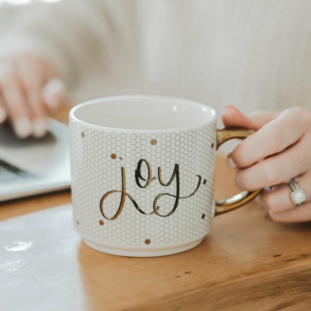 With real gold embellishing on the handle and design, ourΒ Joy Tile Coffee Mug is designedΒ to enhance your coffee drinking experience. This will become your new favorite holiday coffee mug while decorating the tree or wrapping presents! This mug is a great birthday gift or Christmas gift.
