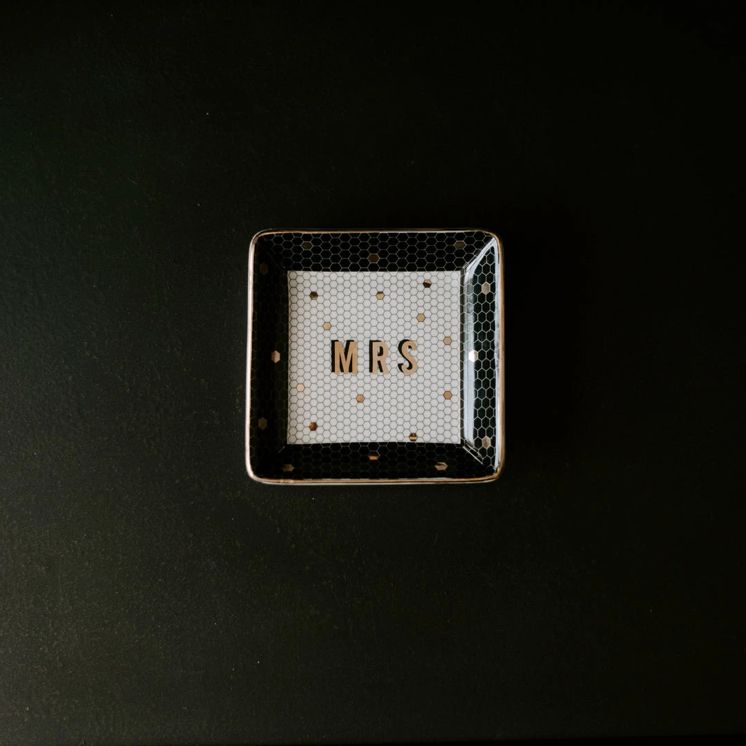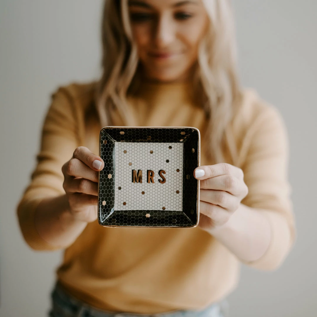 Every bride & bride to be will swoon over their new Mrs.ย Jewelry Dish! Ourย beautiful gold foil tile trinket tray is perfect for placing your wedding ring or earrings to keep them in a safe place. The gold foil details add a touch of chic glam,ย perfect for your office or bedroom! This beautifulย tray also makes a great gift for the bridal showers, weddings or engagement parties!