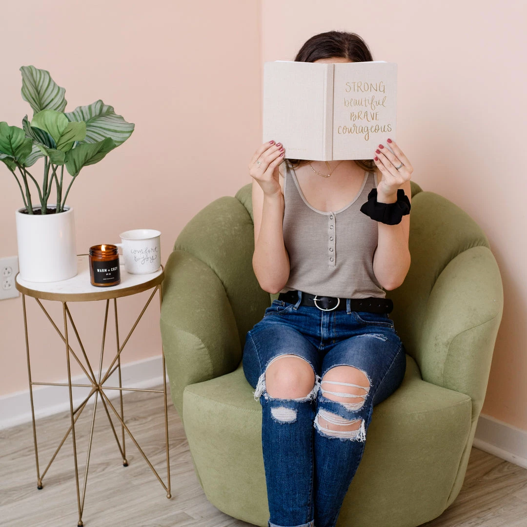 Write down all of your goals and dreams in our handΒ lettered Strong Beautiful Brave Courageous, TanΒ and Gold Fabric Journal!Β With this chic, stylish, easy to write on notebook, there’s no betterΒ place to jot down motivational notes, inspirational quotes, lists,Β and all of your great ideas!Β Perfect for work or school.Β This desk/office accessory makes a great gift!