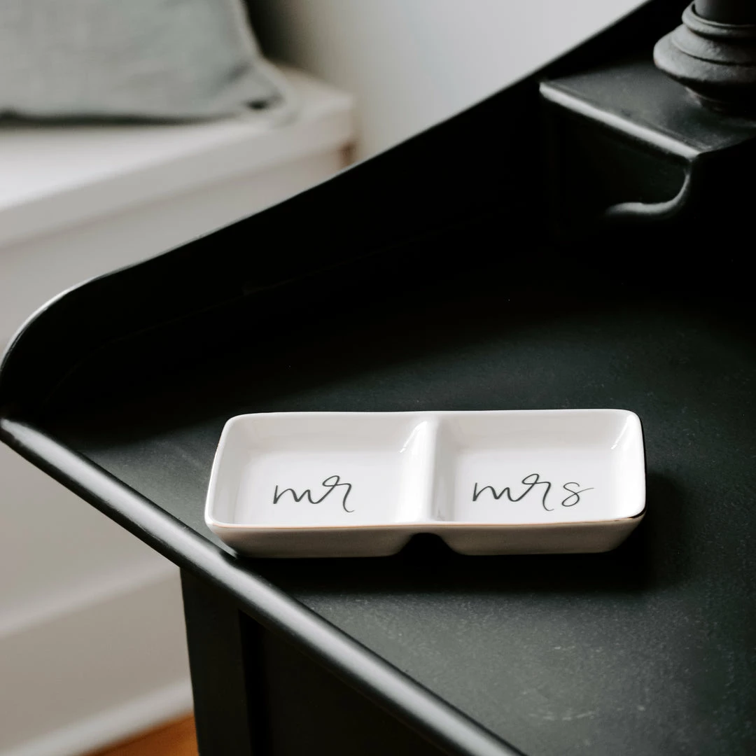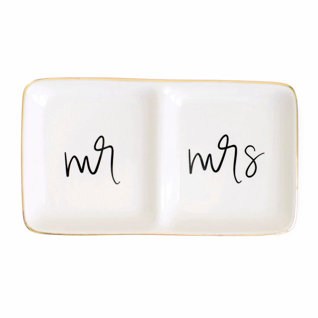 Every bride & bride to be will swoon over their new Mr. and Mrs. Jewelry Dish! OurΒ beautiful gold foil trinket tray is perfect for placing your wedding rings or earrings to keep them in a safe place. The gold foil details add a touch of chic glam,Β perfect for your office or bedroom! This beautifulΒ tray also makes a great gift for the bride to be!