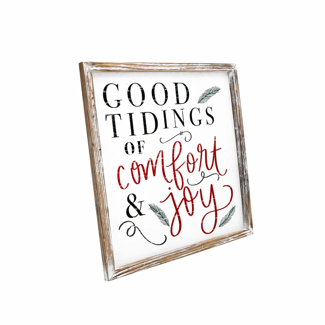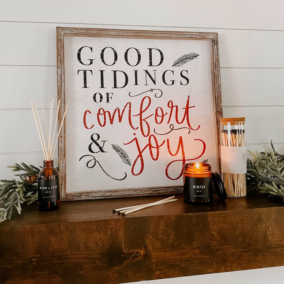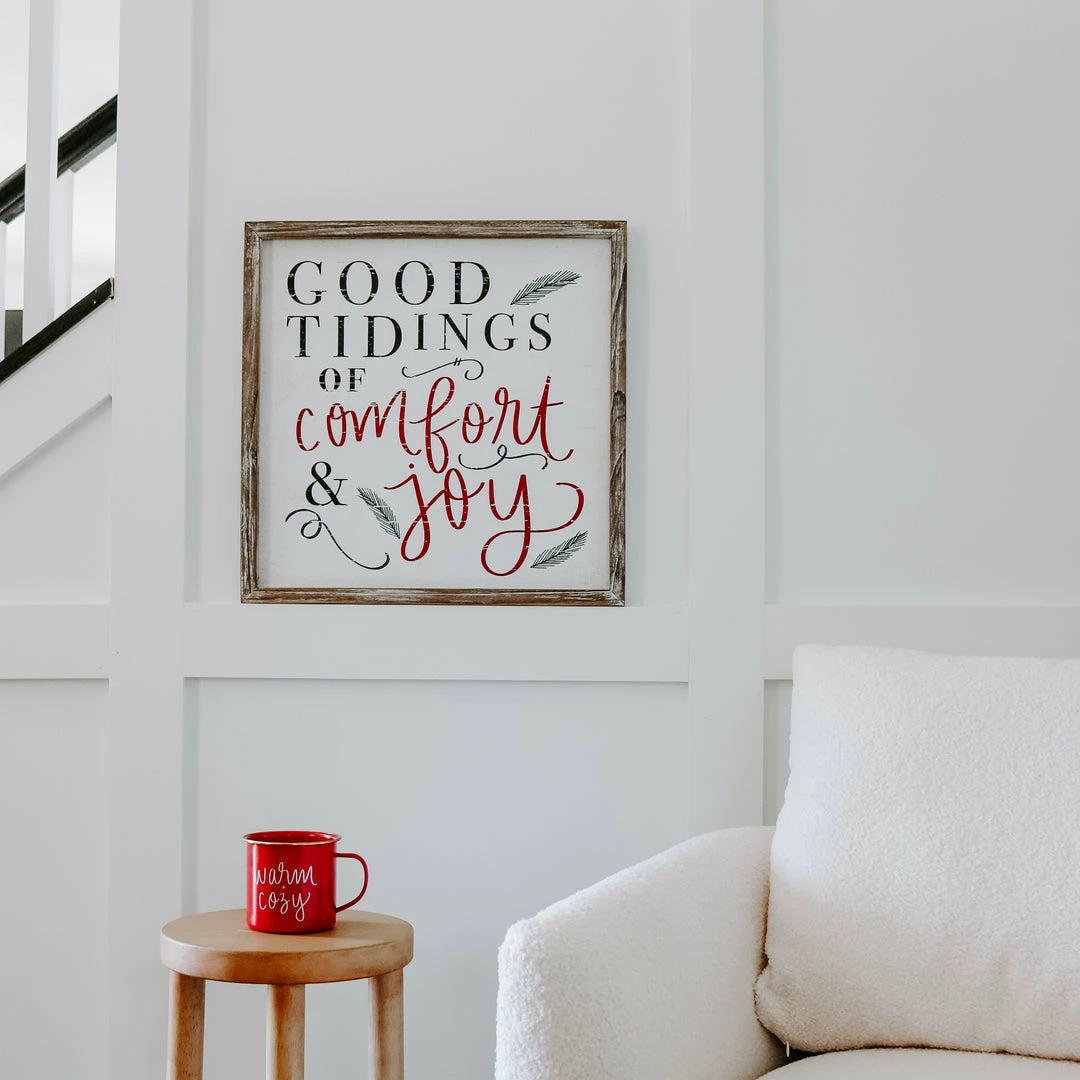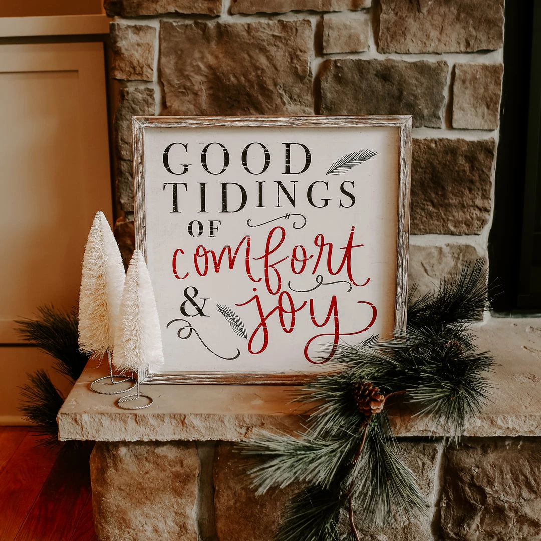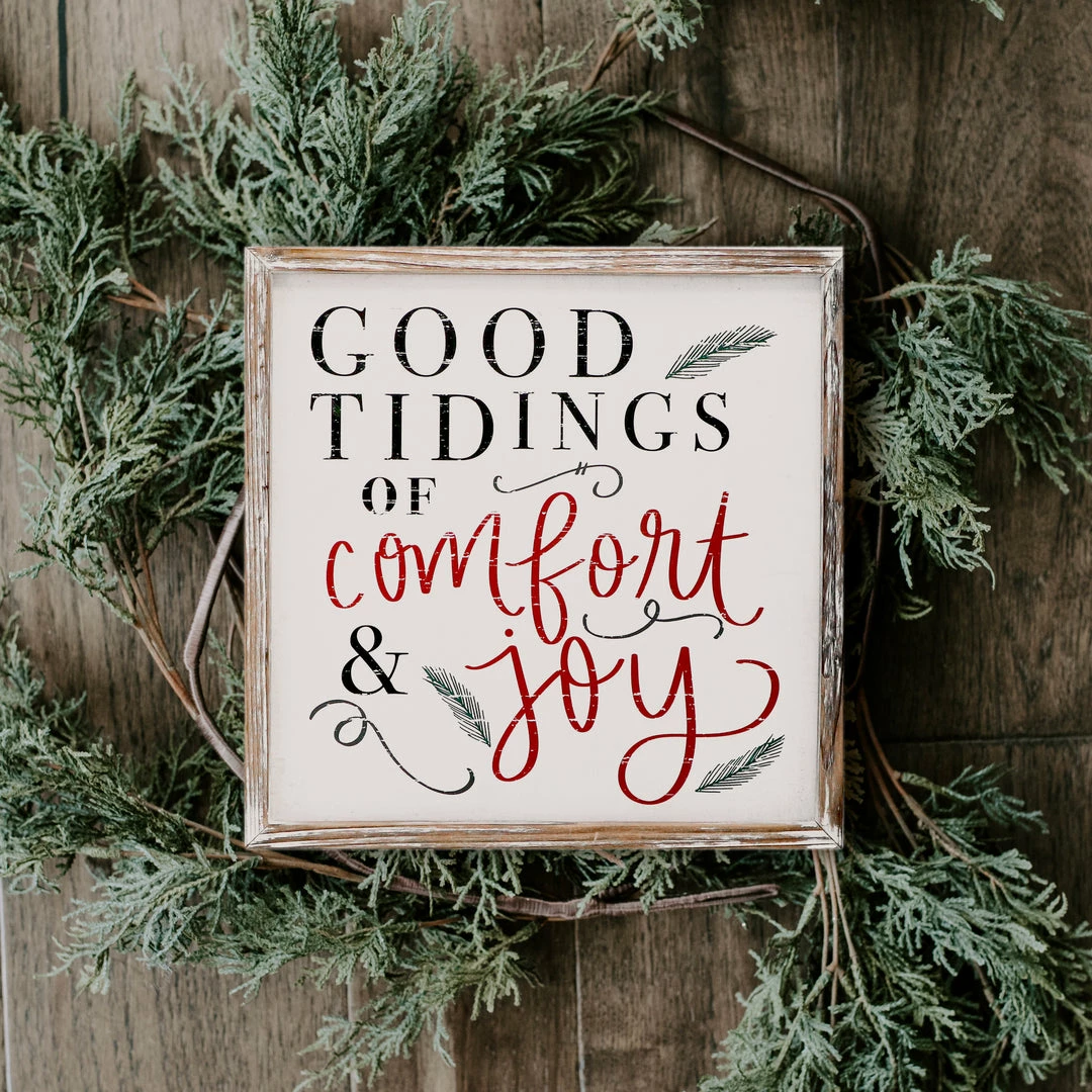Add a rustic farmhouse feel to your Christmas decor with our Good Tidings of Comfort and Joy Wood Sign.Β This sign features a cream background and black lettering with a distressed wood frame.Β Bring the same Christmas magic that you experienced as a child during the holidays to life in your own home.Β Our wood signs make the perfect Christmas gifts!