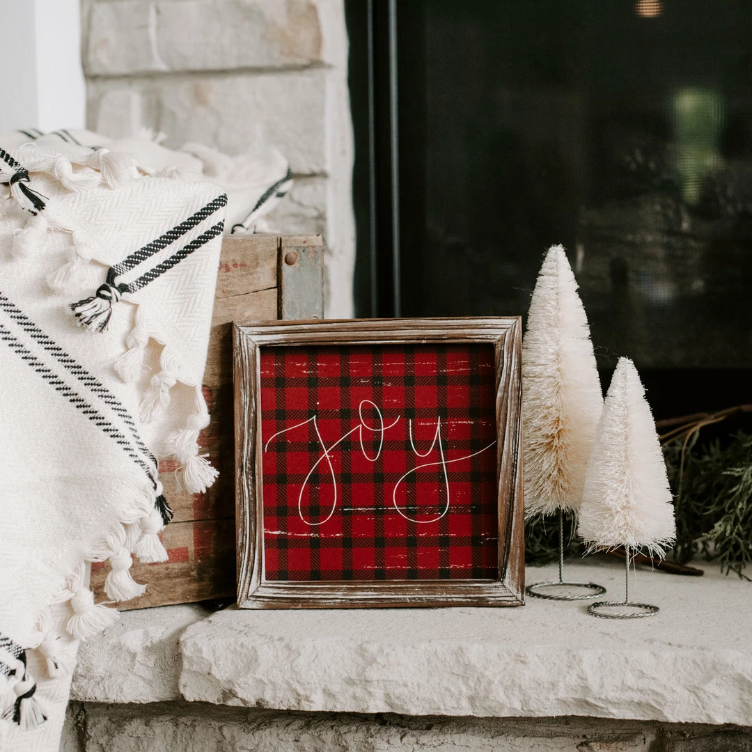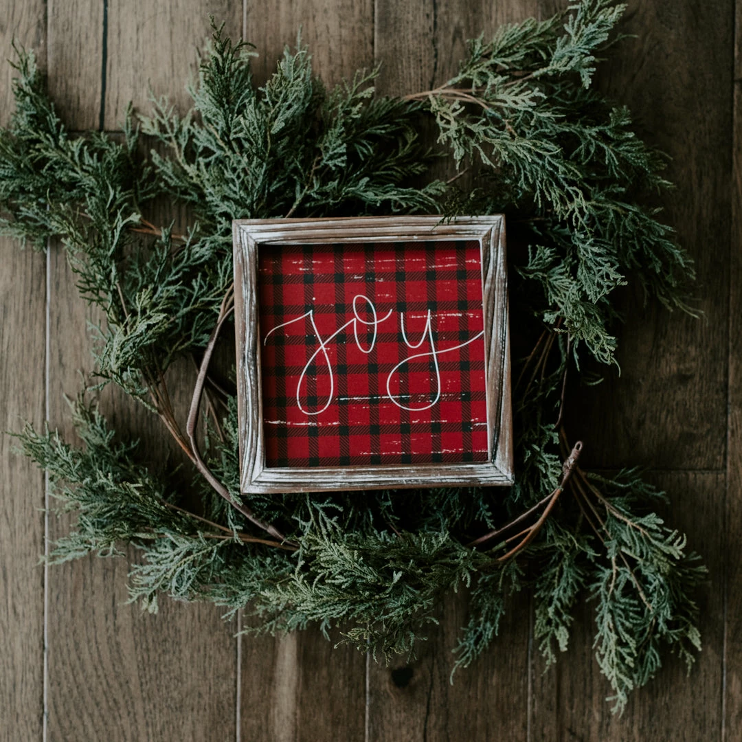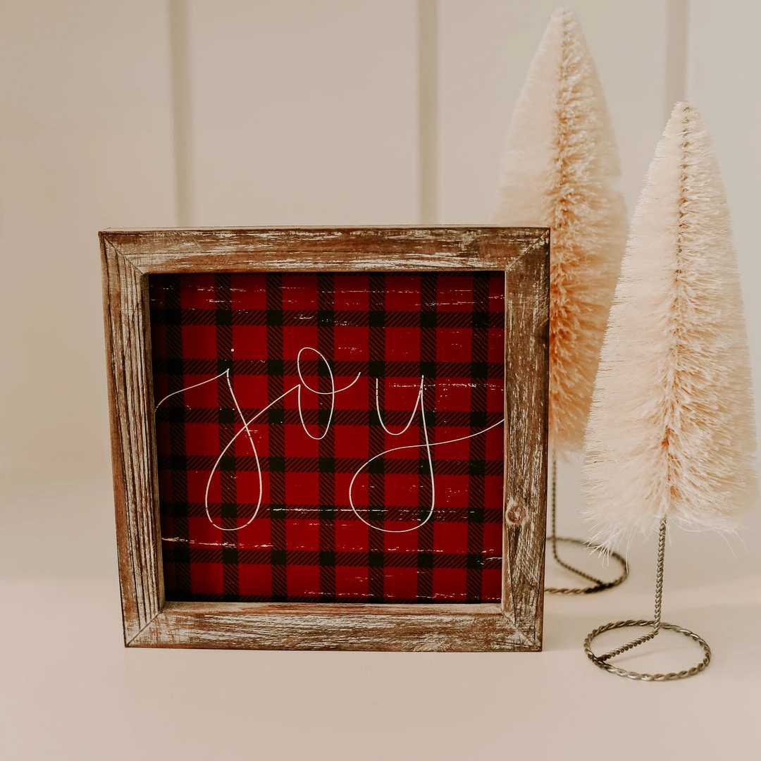 Decorate for the holidays with our JoyΒ plaid woodΒ sign.Β ThisΒ hand lettered rustic sign is painted with a beautiful red plaidΒ and is handmade – each sign is unique.